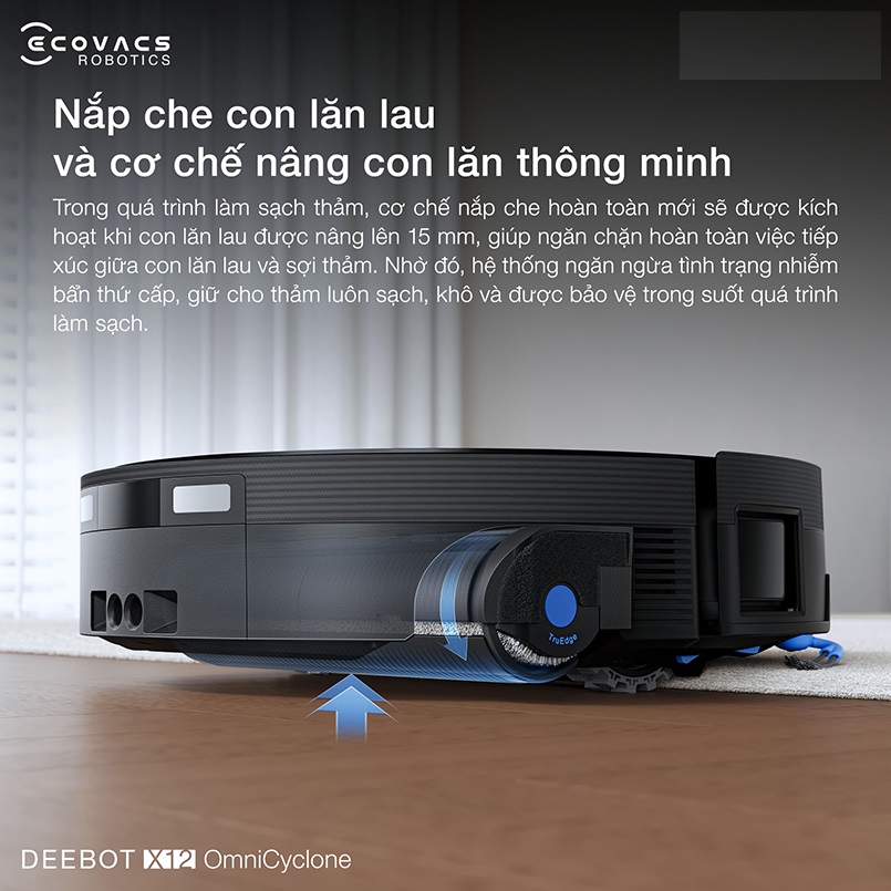 Robot hút bụi lau nhà Ecovacs DEEBOT X12 OmniCyclone được trang bị cơ chế bảo vệ thảm hiện đại với nắp che con lăn tự động. Khi phát hiện khu vực thảm, robot sẽ kích hoạt hệ thống nâng con lăn lên đến 15mm đồng thời đóng nắp che hoàn toàn, ngăn không cho con lăn lau tiếp xúc với bề mặt thảm.