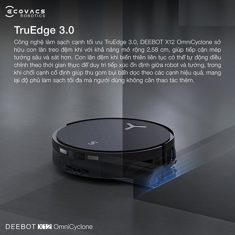 Khả năng làm sạch tại các góc khuất và mép tường của robot hút bụi lau nhà Ecovacs DEEBOT X12 OmniCyclone được nâng cấp đáng kể nhờ công nghệ TruEdge 3.0. Con lăn thiết kế dạng treo đệm khí có thể mở rộng thêm đến 2.58cm, giúp robot tiếp cận sát hơn vào các cạnh tường và khu vực khó làm sạch.