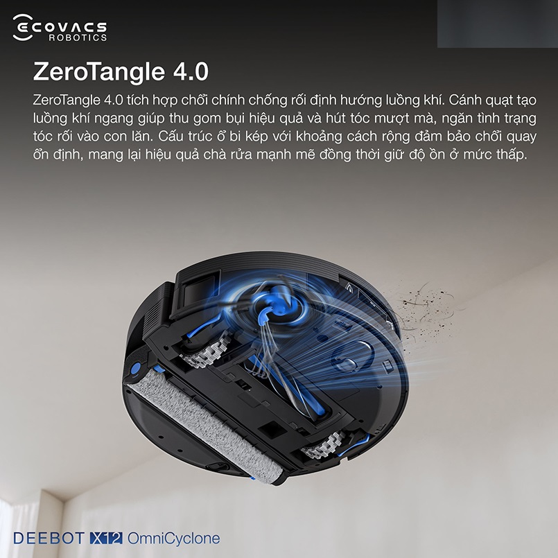 Robot hút bụi lau nhà Ecovacs DEEBOT X12 OmniCyclone được trang bị công nghệ chống rối ZeroTangle 4.0, mang đến trải nghiệm làm sạch tối ưu và hạn chế tối đa tình trạng tắc nghẽn do tóc rụng.
