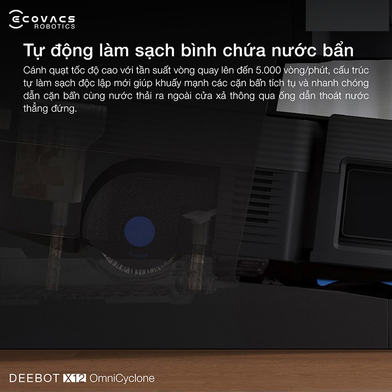 Robot hút bụi lau nhà Ecovacs DEEBOT X12 OmniCyclone được trang bị tính năng tự động làm sạch bình chứa nước bẩn, mang đến giải pháp vệ sinh tối ưu và hạn chế tối đa việc bảo trì thủ công.