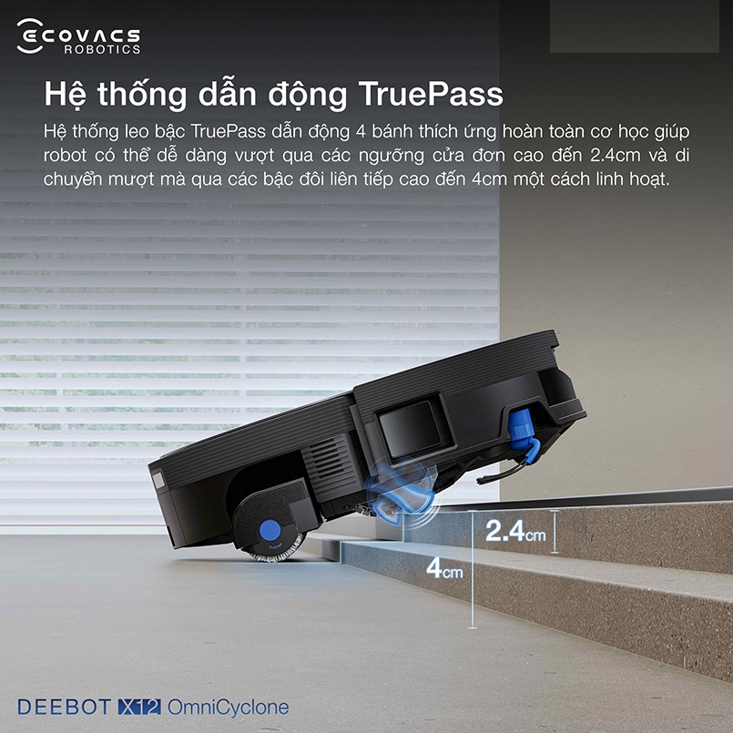 Robot hút bụi lau nhà Ecovacs DEEBOT X12 OmniCyclone được trang bị hệ thống dẫn động 4 bánh TruePass Adaptive, mang đến khả năng di chuyển linh hoạt và vượt chướng ngại vật vượt trội trong mọi không gian sống.