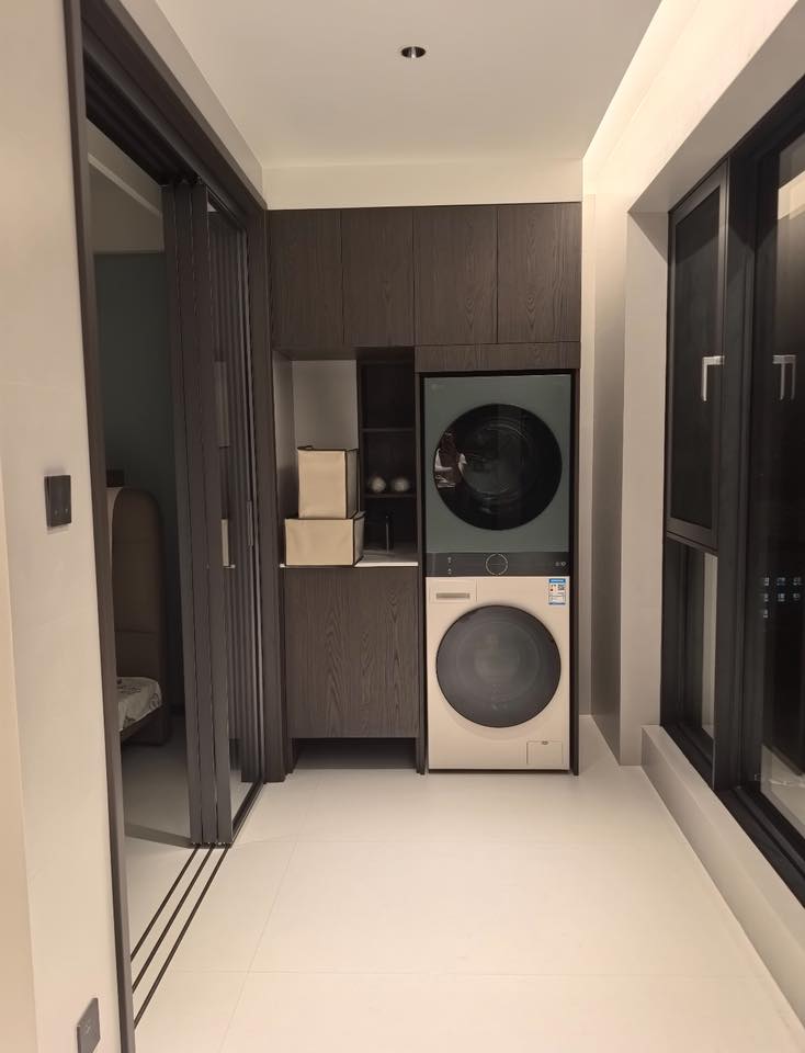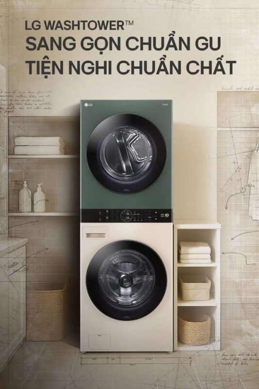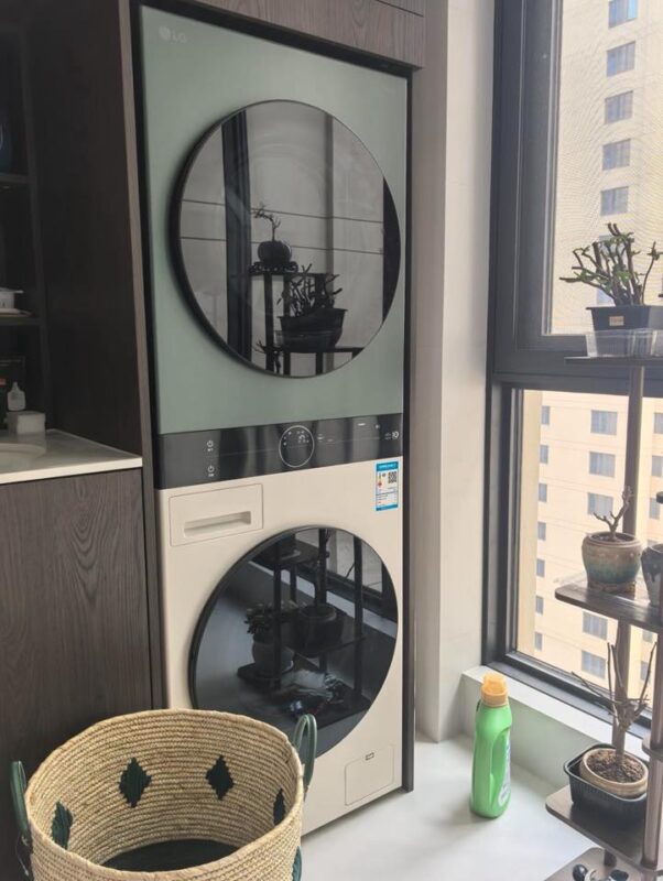 Thiết kế xếp chồng lên nhau tạo thành một khối thống nhất sẽ giúp người dùng tiết kiệm kha khá không gian lắp đặt. Vì thế người dùng có thể linh hoạt lắp đặt máy tại nhiều vị trí, kể cả những không gian nhỏ sao cho thuận tiện với thói quen sử dụng hằng ngày. Hơn nữa thiết kế này cũng giúp cho người dùng hạn chế vướng víu khi di chuyển quần áo như việc lắp đặt hai máy cạnh nhau.