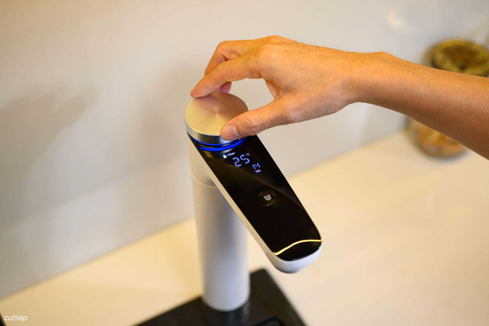 Chỉ cần nhấn một lần vào núm điều khiển, đèn LED ngay dưới núm sẽ sáng màu xanh, tương ứng với mức nước thường 25°C. Sau đó nhấn thêm một lần nữa để nước chảy ra và có thể sử dụng ngay.