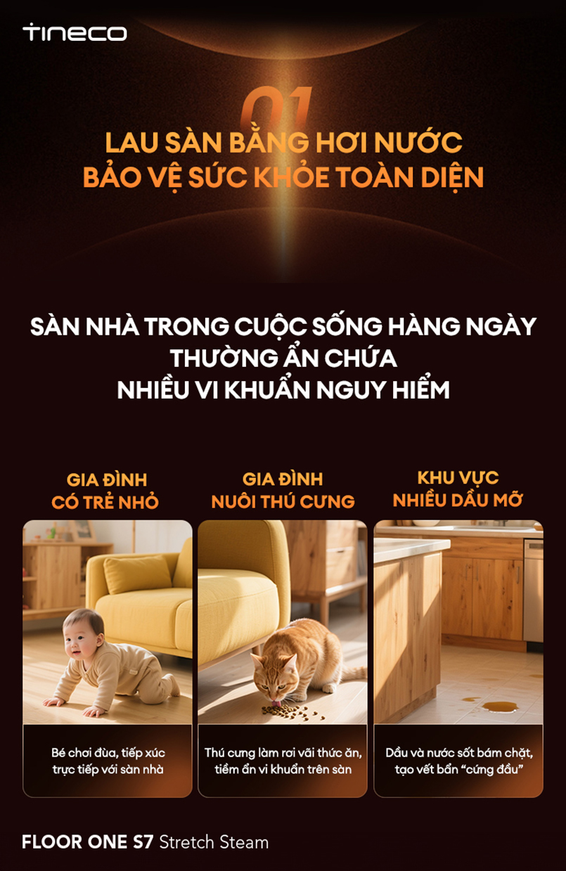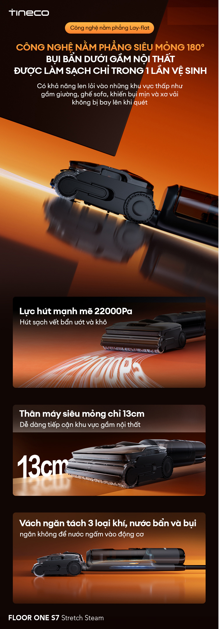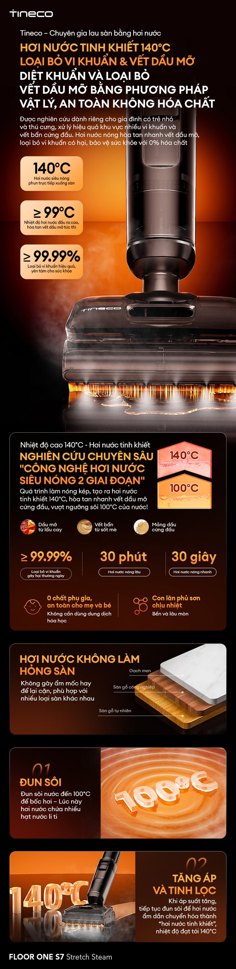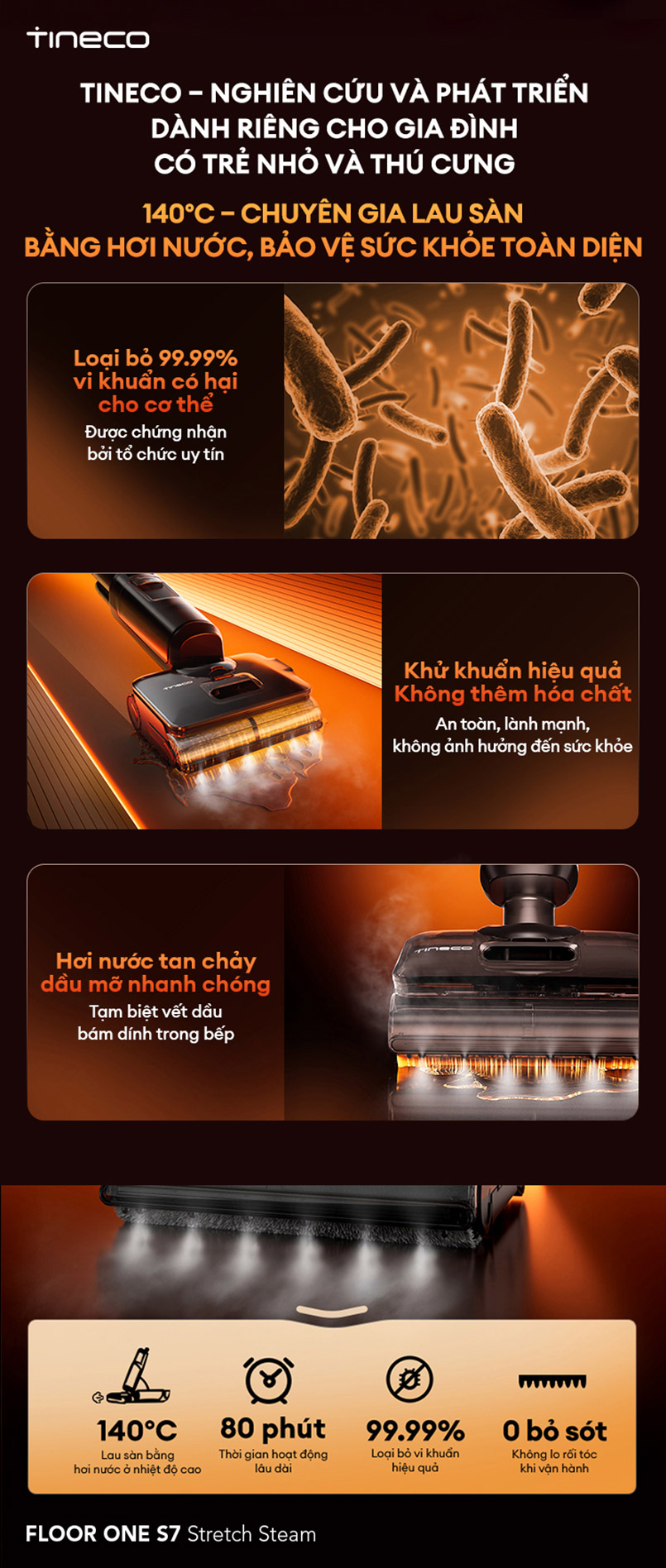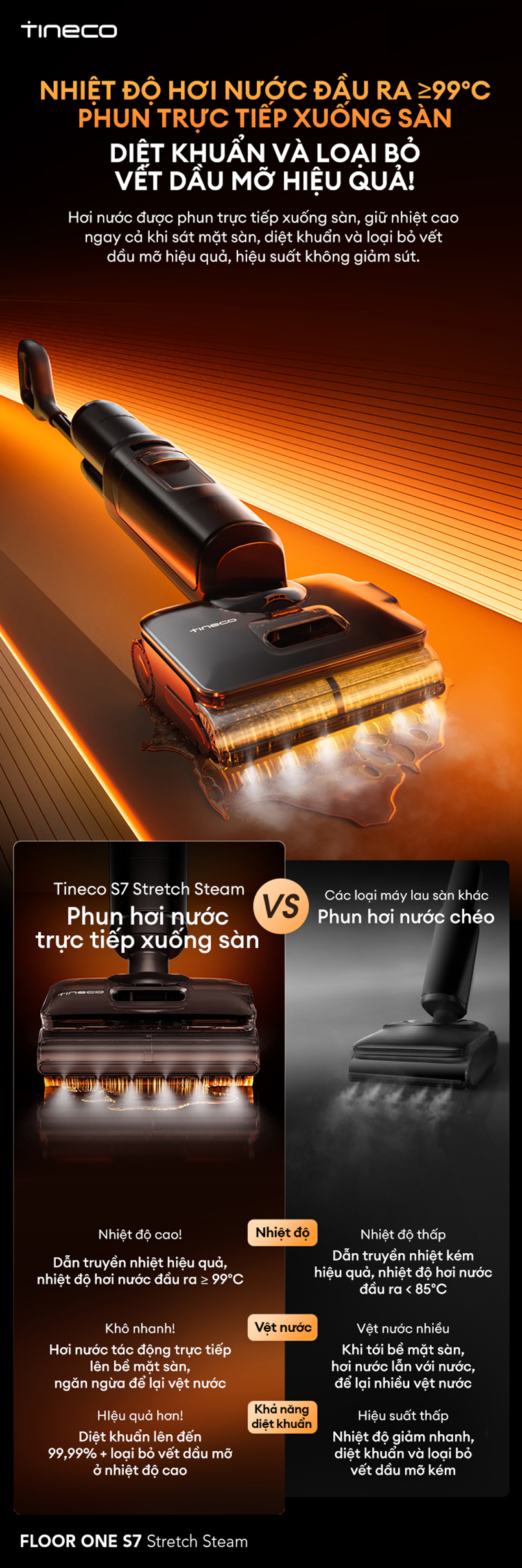 Nhờ sự kết hợp giữa lực hút mạnh mẽ, hơi nước nhiệt độ cao và thiết kế thông minh, Tineco FLOOR ONE S7 Stretch Steam mang lại trải nghiệm lau dọn sạch sâu, nhanh chóng và an toàn cho mọi loại sàn.