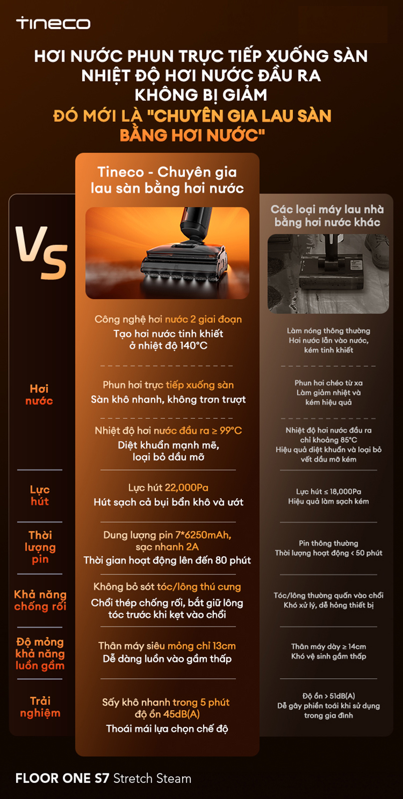 Với sự kết hợp giữa lực hút mạnh mẽ, hơi nước nóng 140℃, và thiết kế gập phẳng linh hoạt 180°, Tineco FLOOR ONE S7 Stretch Steam là lựa chọn hoàn hảo cho những ai đang tìm kiếm máy hút bụi lau nhà hơi nước đa năng, thông minh và hiệu quả – giúp không gian sống luôn sạch khuẩn, khô ráo và an toàn cho cả gia đình.